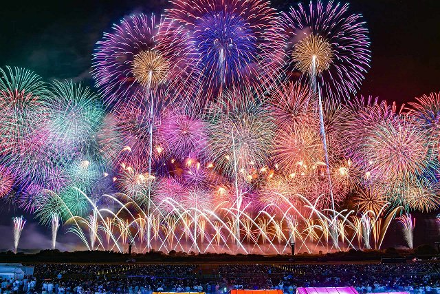 酒田の花火は、東北でも有数のスケールを誇る大会として知られています。全国の有名煙火店による競演に加え、約1万発もの花火が夜空を彩ります。最上川の雄大な河川敷を舞台に、全長1.2kmに及ぶ空中ナイアガラ二尺玉3発同時打ち上げなど、迫力満点のプログラムが展開されるのも大きな魅力です。